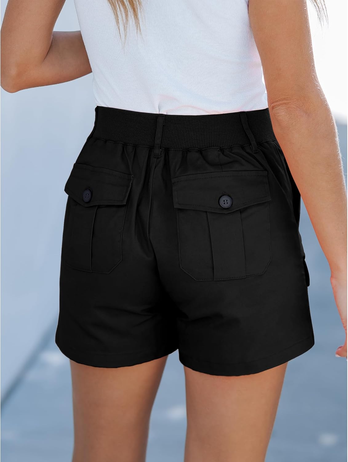 - A pair of cargo shorts women high waist featuring a high-rise waist ,button closure and zip fly. womens cargo shorts with pockets with back elastic waist design.