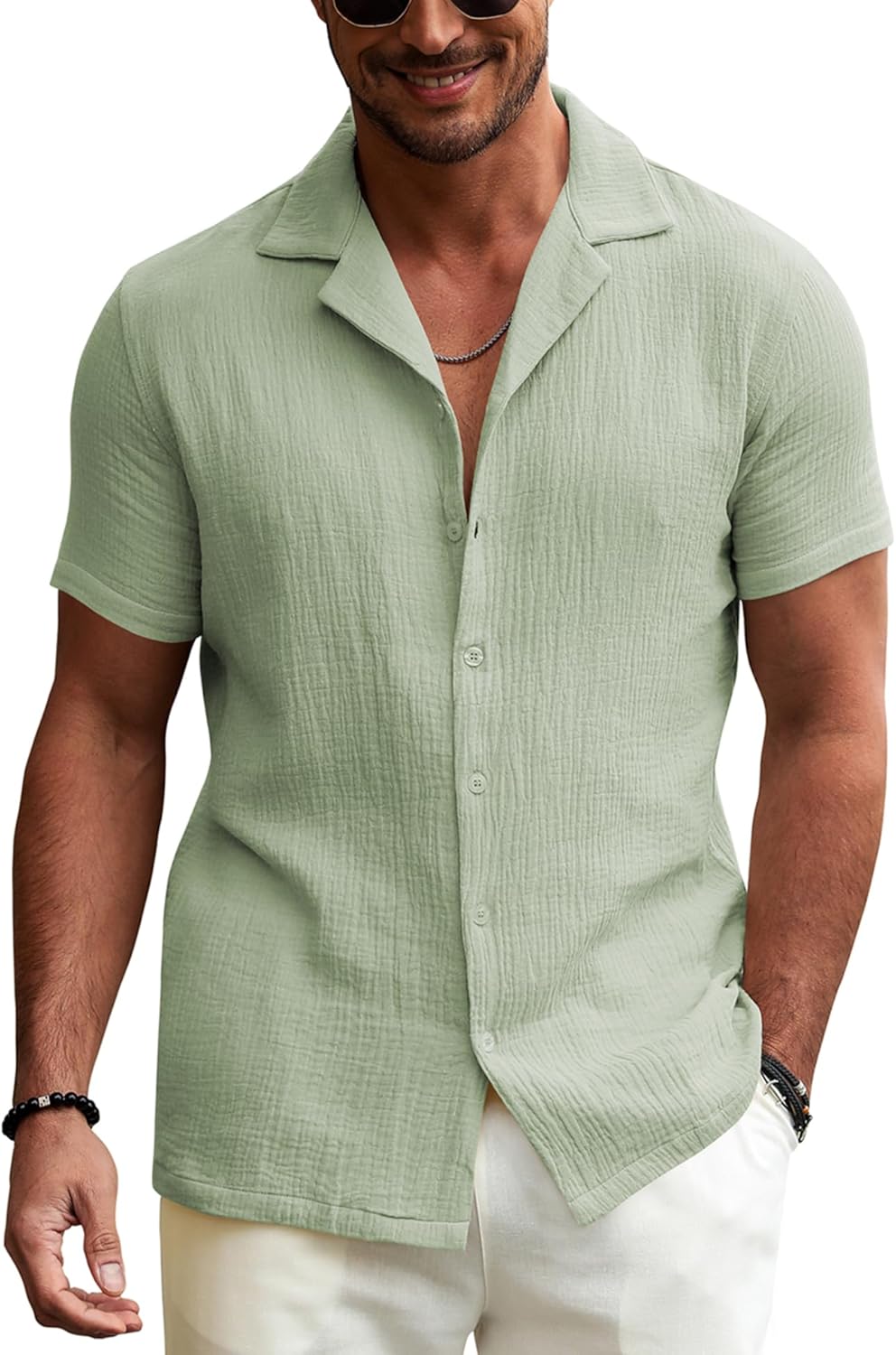 • 【Collocations】: A casual/dressy short sleeve button down shirts needs to be in everyone’s wardrobe. Easily styled with shorts, denims or a tailored trouser, this one is crafted from a breezy cotton gauze with its signature waffle texture