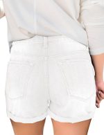 - Stretchy denim shorts for women, the fashion high waisted jean shorts comes with functional 5-pocket, button fly closure, distressing and cuffed hem create a laid-back look.